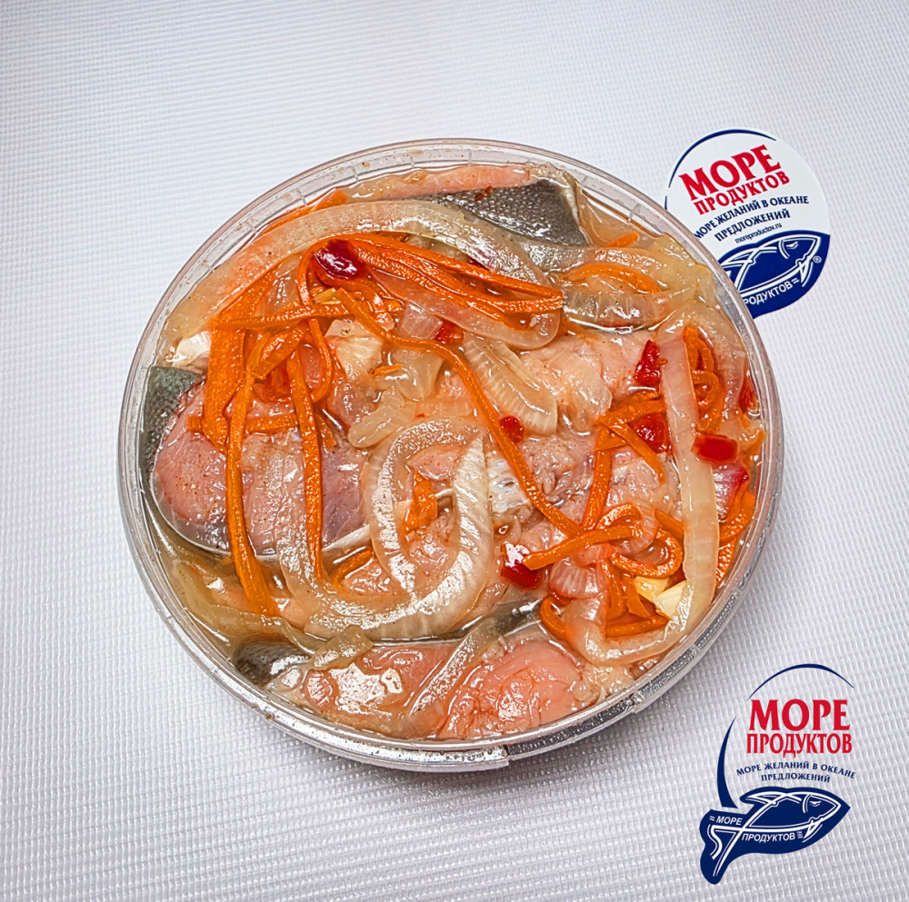 Состав: Горбуша (Oncorhynchus gorbuscha) кусочки, маринад, соль поваренная пищевая, подсолнечное масло, уксус, пряности, маринованные овощи (лук, морковь, красная паприка).